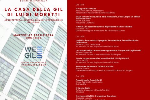 È in programma per martedi 23 aprile, a partire dalle ore 15, presso WEGIL in Largo Ascianghi 5 – Trastevere, l’evento pubblico de “La casa della GIL di Luigi Moretti. Architettura, cultura, giovani e formazione. Ieri e oggi”.
