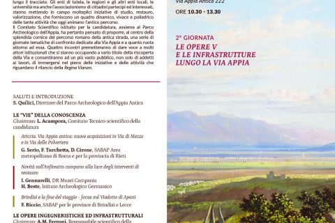 Nel contesto del grande lavoro svolto per la candidatura della Via Appia alla lista del patrimonio mondiale dell’UNESCO, il Comitato scientifico istituito per la candidatura e il Parco Archeologico dell’Appia Antica hanno organizzato delle giornate tematiche di confronto dal titolo “Scoprendo la via Appia. Verso il riconoscimento Unesco”.