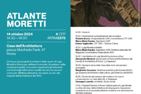 Lunedì 14 ottobre presso la Casa dell’Architettura di Roma si terrà il convegno dal titolo “Atlante Moretti”. Un evento organizzato dall’Ordine degli Architetti PPC di Roma sulla figura di Luigi Moretti, uno dei maestri dell’architettura del ‘900, sulla sua storia fino ai restauri, in atto o da poco ultimati, e sulle sue opere romane.
